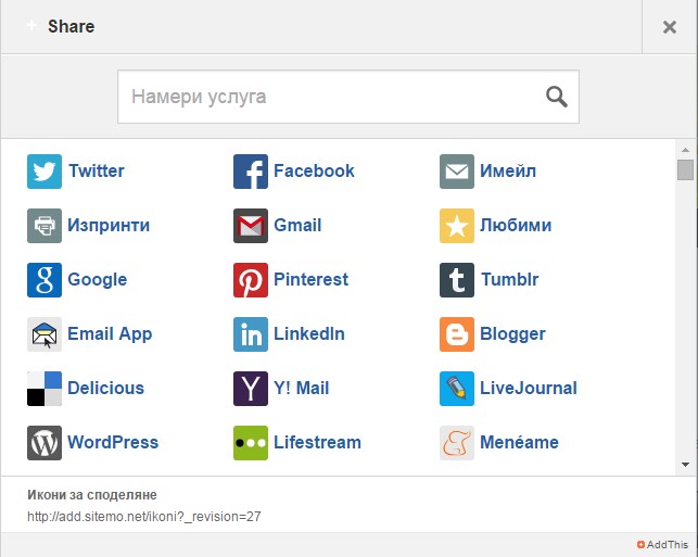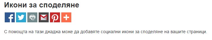 Използвайки тази джаджа с икои за споделяне дава възможност на потребителите ви лесно да споделят връзки към вашето съдържание в техните профили по социалните мрежи.